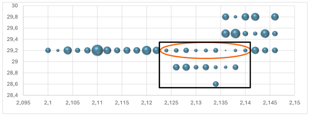 Большинство кучных групп с размером до 0,2 МОА находится в квадрате (рис. 2), образованном диапазонами (28,6-29,4) по навеске и (2,123-2,142) по посадке. То есть, винтовка не только настраивается на экстремальную кучность в узком диапазоне навески и посадки, но и стабильно держит кучность 0,1-0,2 МОА в их очень широком диапазоне.
