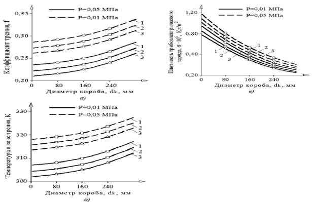 Рисунок 2. Зависимость коэффициента трения (а), температуры в зоне трения (б) и величина плотности трибоэлектрического заряда (в) от диаметра короба при взаимодействии эпоксидного композита с хлопком-сырцом