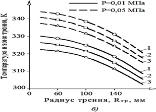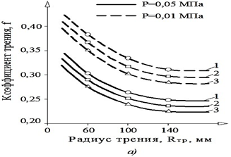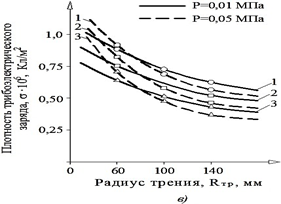 Следует отметить, что чем больше давление и скорость скольжения, тем сильнее влияние радиуса трения Rтp на величину коэффициента трения f и плотности трибоэлектрического заряда в зоне взаимодействия полимерных материалов с хлопком-сырцом. Полученные данные показывают, что оптимальный радиус трения лежит в пределах 140÷160 мм, а именно, в области перехода на стабильные показания её свойств.