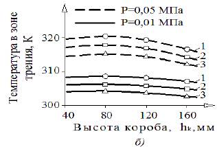 Рисунок 3. Зависимость коэффициента трения (а), температуры в зоне трения (б) от высоты короба при взаимодействии эпоксидного композита с хлопком-сырцом