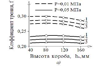 Снижение коэффициента трения с увеличением высоты короба связано с увеличением бокового давления о стенки короба, приводящего к некоторому снижению нормального давления, передаваемого через хлопковую массу. Полученные результаты показывают, что влияние высоты цилиндрического короба hк на коэффициент трения f полимерных и композиционных полимерных материалов согласно приведенных данных хоть и незначителен, но его необходимо считать, оптимальной высотой короба в пределах 60÷80 мм.