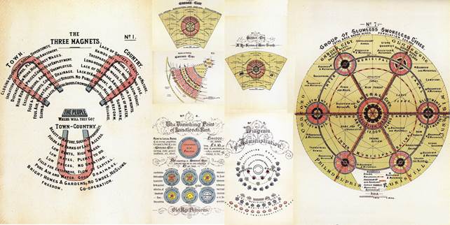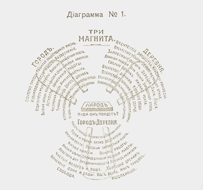 Свою основополагающую базовую концепцию он иллюстрировал через схему «трех магнитов», которые занимают первый разворот книги 1898 года, но более известны сегодня в переработанной версии 1902 года, открывающей книгу «Города-сады завтрашнего дня», которая была опубликована в русском переводе 1911 года, как Диаграмма № 1 (рис. 2).