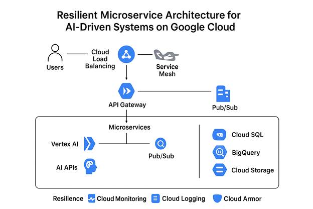 Keywords: Resilient architecture; microservices; fault tolerance; artificial intelligence systems; Google Cloud Platform; Kubernetes; Pub/Sub; Cloud Run; Vertex AI; service mesh; distributed systems; high availability.