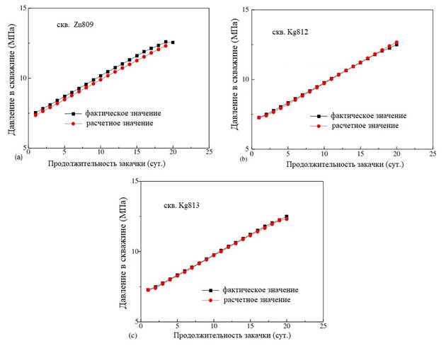Давление в скважине нагнетания рассчитывается по формуле (3) и сравнивается с фактическими данными, которые показаны на рисунке 1(а), (б), (в). Максимальная относительная погрешность между фактическим давлением в скважине и расчетным значением не превышает 3,1%. Таким образом, можно определить точность формулы расчета.