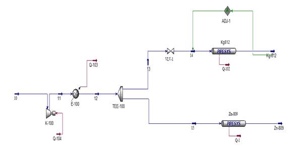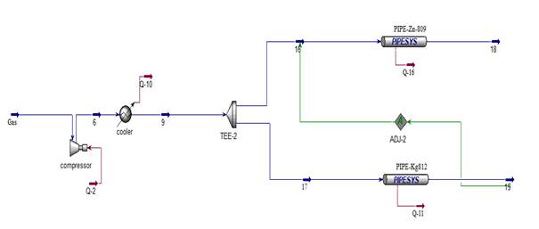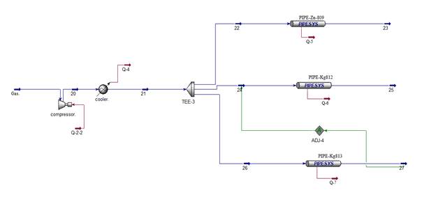 Модель закачки газа с подержанием давления в двух скважинах, созданная с помощью программного обеспечения для моделирования Aspen HYSYS, показана на рисунке 3. После снижения температуры закачиваемого природного газа начинается процесс закачки его в скважины Zn-809 и Kg-812 по нагнетательному трубопроводу.