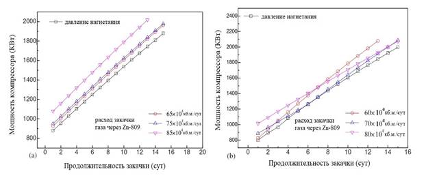 Исследуя две группы скважин куда одновременно закачивается природный газ: первая группа - Zn-809, Kg-812 и вторая группа - скважины Zn-809, Kg-813, была получена зависимость изменения мощности компрессора от времени нагнетания газа при различных режимах закачки и при общем расходе газа, равном 120×104 м3/сут, (рисунок 5а и 5b).