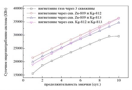 В условиях закачки с подержанием давления изучается взаимосвязь между ежедневным потреблением энергии системой и временем закачки, когда нагнетается газ в две и три скважины одновременно. Результаты показывают, что энергозатраты при одновременной закачке газа в две скважины намного выше, чем при одновременной закачке газа в три скважины. Следовательно, одновременная закачка газа в три скважины является лучшей схемой закачки.