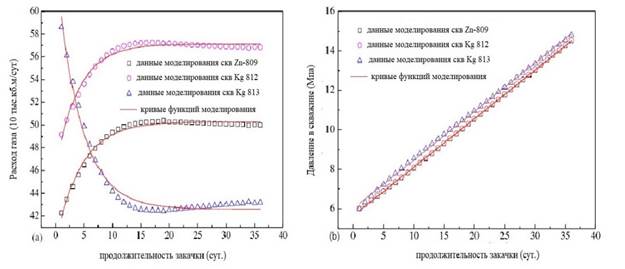 На рисунке 7(а) показано изменение расхода нагнетания природного газа в зависимости от времени закачки (для одновременной закачки газа в три скважины). Исходя из рисунка 7 можно увидеть, что на начальном этапе закачки поток газа из скважины J103 значительно выше, чем из скважин Zn-809 и Kg-812.