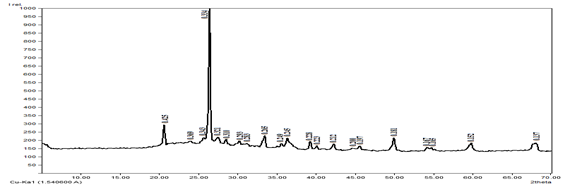 Objects and methods of research. Chemical-analytical, X-ray diffraction, and electron microscopic analyses were used to determine the properties of bentonite clay and secondary waste in the production of expanded clay. The chemical composition of bentonite clay and secondary waste was determined using chemical-analytical analysis. The mineralogical composition of this clay and secondary waste was determined by X-ray diffraction method. The mineral composition of bentonite clay and secondary waste was determined using a Shimadzu LABX XRD-6100 diffractometer with CuKα radiation and powder analysis technique. X-ray diffraction patterns were obtained with a step of 0.02, while the tube current and voltage were set at 30 mA and 30 kV, respectively. Scanning electron microscopic analysis of the sample was carried out using a SEM - EVO MA 10 (Zeiss, Germany) scanning electron microscope, utilizing backscattered electrons with Signal A=SE 1, under the following imaging conditions: voltage ENT-15.0 kV, working distance WD - 8.5 mm. The characterization of phase composition and determination of structural properties of raw materials and glass samples were performed using reference materials [2-3].