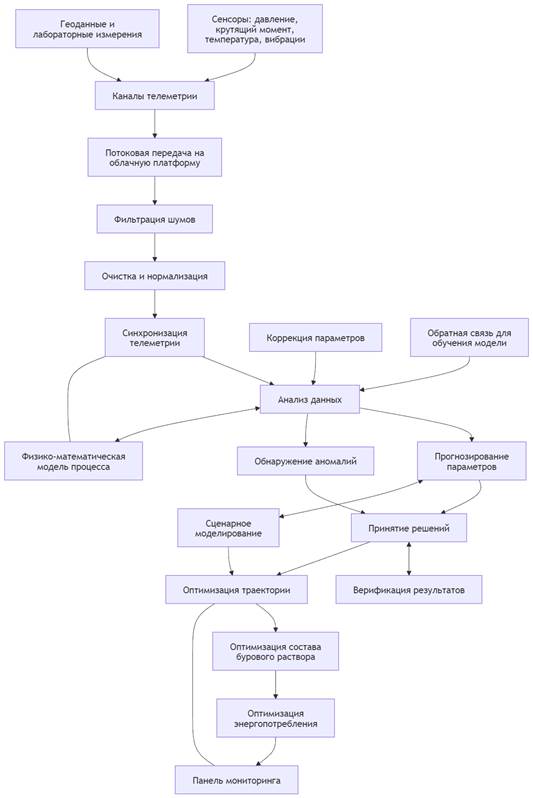 Ключевым преимуществом внедрения ИИ в процессы ГНБ становится способность систем к самообучению. В отличие от традиционных экспертных систем, которые требуют постоянной корректировки человеком, современные алгоритмы глубокого обучения способны автоматически улучшать свои предсказания при накоплении новых данных [1, с. 104]. Это особенно важно для бурения, где каждый проект уникален: различается геология, глубина, плотность пород, состав бурового раствора и конструкция оборудования.