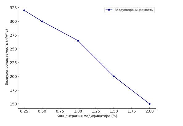 В ходе исследований также изучалось влияние концентрации модификатора на воздухопроницаемость тканей. Результаты показали, что с ростом концентрации воздухопроницаемость снижается. При исходно низкой концентрации щели между волокнами ткани были широкими, что обеспечивало свободное прохождение воздуха. Однако с увеличением количества модификатора межволоконные щели заполнялись налётом, затрудняющим прохождение воздушного потока. В результате этого воздухопроницаемость ткани снижалась до минимального значения при концентрации 2,0%.