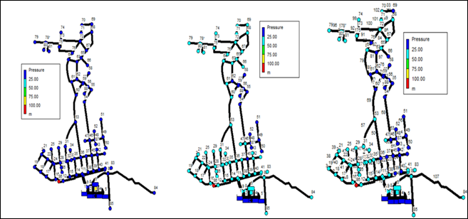 Заключение. В городе Нурафшан из-за хаотичной застройки и отсутствия учёта гидравлических процессов в водопроводных сетях в 27 точках из 88 узлов наблюдается падение давления от 0 до 2,5 атмосфер в рабочее время. Снижение давления в этих точках затрудняет обеспечение населения достаточным количеством воды. В тупиковых участках в одной точке давление превышает допустимый уровень, что приводит к частым повреждениям на данном участке.