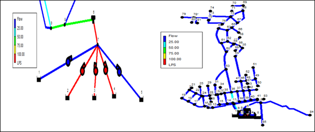 Рисунок 4. Моделирование расхода воды в узлах системы водораспределения центрального водораспределительного сооружения