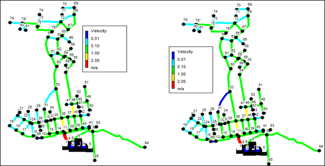 Рисунок 5. Моделирование скорости движения воды в трубопроводах системы водораспределения центрального водораспределительного сооружения