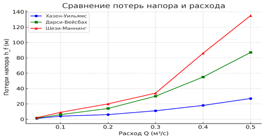 Рисунок 6. Напорные потери в зависимости от расхода (сравнение формул Хазена–Уильямса, Дарси–Вейсбаха и Шези–Маннинга)