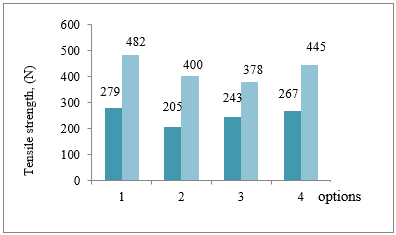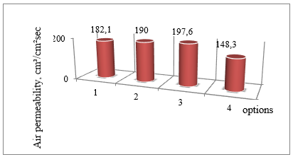 The change in the raw material in the fabric led to a change in the physical and mechanical properties of the two-layer knitted fabric. The air permeability of the experimental samples of the double-layer knitted fabric varies from 148.3 to 197.6 cm3/cm2*sec (Fig 1.).