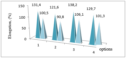 The elongation at break along the width of the knitted fabric in variant I was 100.5%, variant II was 90.8%, variant III was 106.1%, variant IV was 101.3%, ranging from 90.8% to 106.1%. The second variant, made from 100% bamboo, had the lowest elongation at break, which was 90.8% (Fig 3).