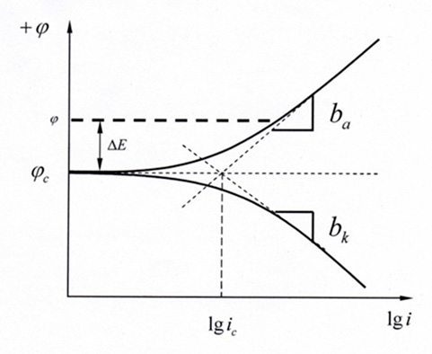 Принцип получения icorr с помощью метода экстраполяции по Тафелю. Программное обеспечение Corrtest CS studio может автоматически выполнять подгонку поляризационной кривой. Что позволит определить коэффициенты Тафеля на анодном и катодном участках, т.е. ba и bc. а также затем получить icorr. Основываясь на законе Фарадея и в сочетании с электрохимическим эквивалентом материала, мы можем определить корость коррозии металла (мм/год).