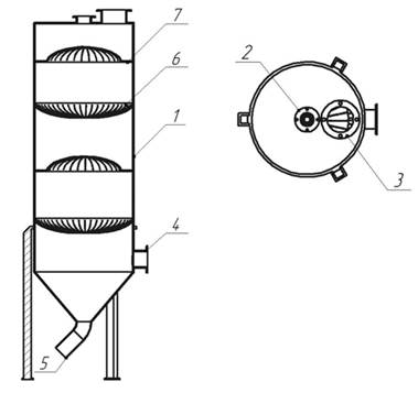 1 – cylindrical body; 2 – loading pipe; 3 – coolant outlet pipe; 4 – coolant inlet pipe; 5 – material discharge pipe; 6 and 7 – cascade nozzles.