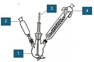 1-Трехгорлая круглодонная колба, 2- капельная воронка, 3- сосуд для смешивания, 4- охладитель