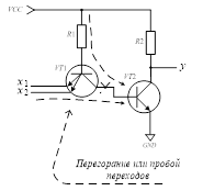 Логические устройства синтезируются на базе полупроводниковых элементов и в совокупности использования тех или иных полупроводников составляют определенную базу (логику) построения (ТТЛ, ТТЛШ, МОП) данных устройств [5, 6, 13]. На рис. 1 приводится логический элемент И-НЕ, построенный по ТТЛ (транзисторно-транзисторной логике) логике, в котором показаны некоторые возможные неисправности в структуре логического элемента.