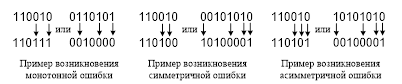 На рабочих выходах дискретных устройств могут проявляться ошибки следующих видов [20]: монотонные – когда происходит однонаправленная трансформация разрядов (только нулей или только единиц); симметричные – когда происходит одинаковое количество трансформаций нулей и единиц; асимметричные – когда происходит неравное количество трансформаций нулей и единиц. На рис. 2 приведены примеры возникновения ошибок разного вида.