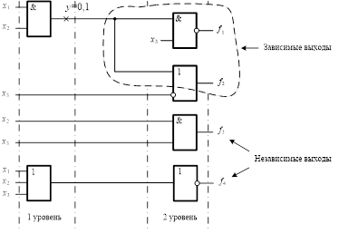 Выходы схемы f1 и f2 на схеме рис. 3 являются структурно зависимыми.