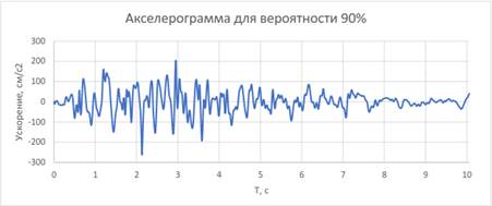 Рисунок 3. Акселерограмма для вероятности 90% По нормативным картам общего сейсмического районирования Республики Узбекистан ОСР-2017 исходная сейсмичность строительной площадки составляет I=8 баллов по шкале MSК-64