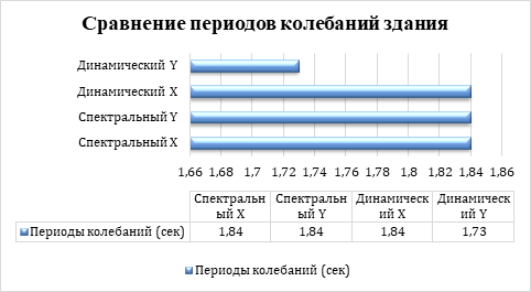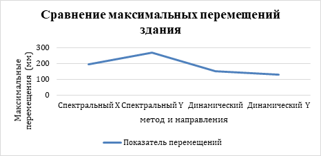 Сравнительный анализ показал, что значения периодов колебаний по обоим методам практически совпадают (1,73–1,84с). Однако перемещения по спектральному методу существенно выше, чем по динамическому. Например, в направлении Y перемещение по спектральному методу составило 271 мм, в то время как по динамическому методу – 132 мм. Это объясняется тем, что спектральный метод учитывает расчетный спектр, который задается с запасом надежности.