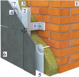 Рисунок 1. Общий вид вентилируемого фасада с воздушной прослойкой: 1 – основной слой кладки – кирпич, 2 – система крепления, 3 – утеплитель – минеральная вата, 4 – дюбель, 5 – вентилируемая воздушная прослойка, 6 – облицовочная панель, 7 – ветро-влагозащитная мембрана, 8 – кронштейн.