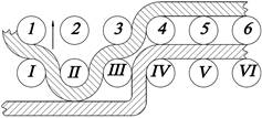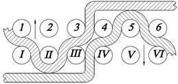 Рисунок 2. а)2-слойное переплетение тканей, где нити основы верхнего слоя, нити утка нижнего слоя и нити основы нижнего слоя соединены слоями смешанным способом с нитями утка верхнего слоя; б) Переплетение тканей, слои которых соединены дополнительными нитями основы