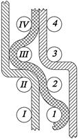 Результаты. Двухслойные ткани, состоит из двух слоев, прочно соединенных между собой. Они могут быть двухлицевыми и двусторонними. В двусторонних тканях верхний и нижний слои можно вырабатывать из нитей различных видов волокнистого состава, линейной плотности и качества. Благодаря этому можно получать ткани, в которых на лицевой стороне использовано сырье лучшего качества, чем на изнаночной. Кроме того, такой способ позволяет разнообразить ассортимент двухслойных тканей. Соединение слоев осуществляют различными способами: сверху вниз — за счет дополнительного переплетения нитей основы верхнего слоя с нитями утка нижнего слоя (рис. 1, а); снизу вверх — за счет дополнительного переплетения нитей основы нижнего слоя с нитями утка верхнего слоя (рис. 1 ,6 ); комбинированным — за счет дополнительного переплетения основы верхнего слоя с нитями утка нижнего слоя и дополнительного переплетения нитей основы нижнего слоя с нитями утка верхнего слоя (рис. 1, в); прижимными (дополнительными) нитями основы 1, г). При выборе способа соединения слоев двухслойной ткани учитывают соотношение между нитями слоев; линейную плотность, цвет и качество нитей в слоях; вид базовых переплетений слоев; назначение ткани и требования, предъявляемые к ней; конструктивные особенности ткацкого станка, предназначенного для выработки ткани.