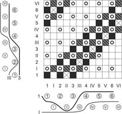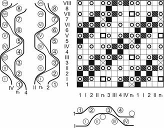 Методы. Для образования полой ткани требуются две основы, которые навивают на один общий навой (в отдельных случаях они могут быть навиты и на два навоя). Нити основы, навитые на один общий навой, в процессе образования ткани на станке будут подразделяться на две части, необходимы е для образования каждого отдельного слоя ткани [1-4]. Соотношение нитей основы и утка в различных слоях 1:1. При построении полых переплетений следует учитывать ряд факторов. Так, ввиду того что в образовании ткани участвуют два слоя, необходимо различать нити основы и утка соответственно верхнего и нижнего слоев. При изображении переплетения на бумаге нити основы и нити утка разных слоев смещаются в одну плоскость. При прокладывании утка в верхнем слое нити основы нижнего слоя находятся в нижнем положении. При прокладывании утка в нижнем слое нити основы верхнего слоя должны быть подняты. При построении рисунка переплетения двухслойной ткани нити верхнего и нижнего слоев располагают рядом друг с другом.