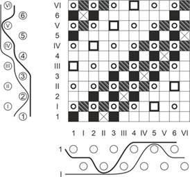 Построить заправочный рисунок двухслойной ткани с соединением слоев по способу сверху вниз. Базовое переплетение слоев — саржа 2/2. Соотношение между числом нитей в слоях — 1:1. Изобразим переплетение внешней стороны верхнего слоя (рис. 2, а), внешней стороны нижнего слоя (рис.2,6), внутренней стороны нижнего слоя (рис. 2, в), а так ж е дополнительное переплетение саржа 3/1 (рис. 2, г), осуществляющее соединение слоев способом сверху вниз.