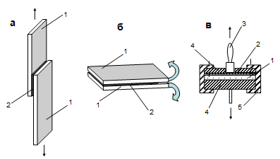 Рисунок 1. Схемы методов оценки адгезии печатных красок к полимерным пленкам: а - метод сдвига, б – метод на расслаивание, в – метод отрыва: