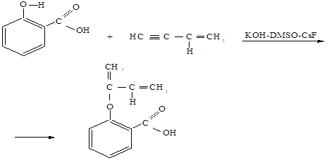Для реакции синтезированного винилацетилена с салициловой кислотой сначала к 0,08 моль салициловой кислоты добавляли 100 мл 35%-ного раствора гидроксида калия и оставляли смесь на магнитной мешалке до образования однородного раствора. Полученный раствор охлаждали до -2-3°C, а полученный раствор винилацетилена в о-ксилоле соединяли с колбой Дрекселя, содержащей 2-гидроксибензойную кислоту. Раствор нагревали для отделения растворенного в растворе винилацетилена от раствора, после чего выделяющийся из него газ пропускали в раствор салициловой кислоты. Процесс продолжали в течение 50-60 минут до насыщения раствора винилацетилена салициловой кислотой. Полученную реакционную смесь охлаждали, растворяли в дистиллированной воде и экстрагировали диэтиловым эфиром. Происходивший процесс можно описать следующей реакцией: