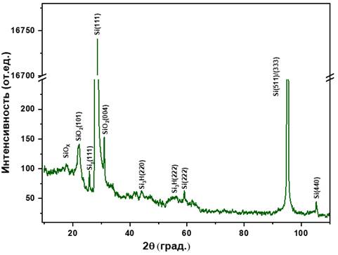 Дифрактограмма исходного образца Cz−Si (рис. 1) демонстрирует интенсивный рефлекс Si(111) при угле 2θ=28,62°, что свидетельствует о высоком кристаллическом совершенстве материала. Наличие слабых рефлексов, отнесенных к фазам SiO2 и Si3H, является ожидаемым. Фаза SiO2 закономерно присутствует в виде кислородных преципитатов, так как кремний, выращенный методом Чохральского, изначально содержит высокую концентрацию растворенного кислорода [6]. Фазы гидрида кремния (Si3H), в свою очередь, являются следствием взаимодействия поверхности кристалла с водородом, выделяющимся в процессе химического травления в травителе CP-4.