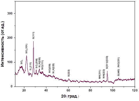 На дифрактограмме также идентифицированы фазы NiO и гидриды никеля (NiH, Ni3H). Их образование, по аналогии с исходным образцом, связано с взаимодействием введенного никеля с фоновыми примесями: кислородом, изначально присутствующим в Cz−Si, и водородом, поступающим из травителя в процессе ЖХТ.
