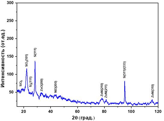Ключевым результатом для этого образца является идентификация рефлексов, принадлежащих новой фазе — интерметаллическому соединению ZnNi [13-15]. Это свидетельствует о том, что при совместном присутствии атомы Ni и Zn активно взаимодействуют друг с другом, формируя нанокристаллические преципитаты новой фазы со средним размером зерен 14–25 нм. Таким образом, в системе реализуется сложный механизм: часть атомов никеля остается в междоузлиях решетки Si, вызывая ее сильную дисторсию, в то время как другая часть реагирует с атомами цинка, образуя термодинамически более стабильные интерметаллические включения.