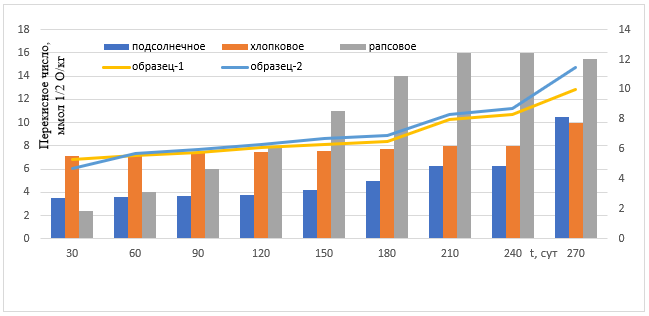 Рисунок 4. Влияние продолжительности хранения на перекисное число масел