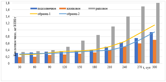 Рисунок 3. Влияние продолжительности хранения на кислотное число масел