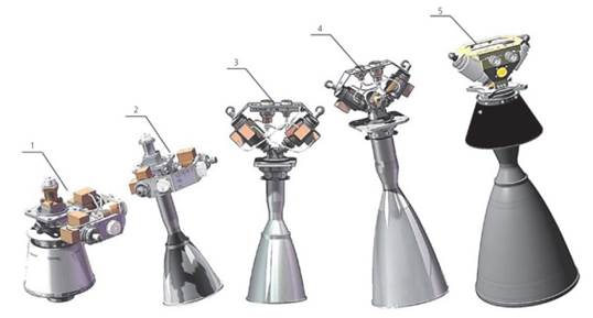 Рисунок 4. Двухкомпонентные жидкостные ракетные двигатели малой тяги: 1 - С5.142; 2 - С5.145; 3 - С5.144; 4 - С5.146, 5 - С5.146