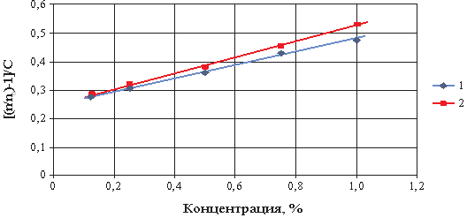 Экспериментально определенные отношения η/η0=t/t0 при различных концентрациях сополимера С, используются для построения графика зависимости [(η/η0-1]/С от С и для определения характеристической вязкости при экстраполяции этой зависимости к нулевой концентрации.
