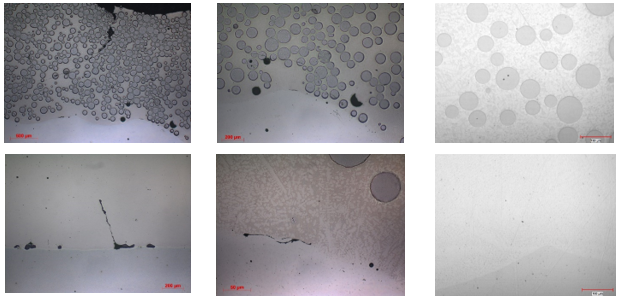 По изображениям микроструктуры наплавленного слоя видно, что у образцов 1 и 2 в наплавленном металле наблюдаются поры, а возле линии сплавления – трещины. Следует признать, что трещины могли образоваться и при изготовлении образцов, поскольку нанесённый слой является твёрдым, но хрупким. Для всех трёх образцов наблюдается неоднородное распределение карбидов вольфрама, что непосредственно влияет на твёрдость материала и, соответственно, на его эксплуатационные характеристики.