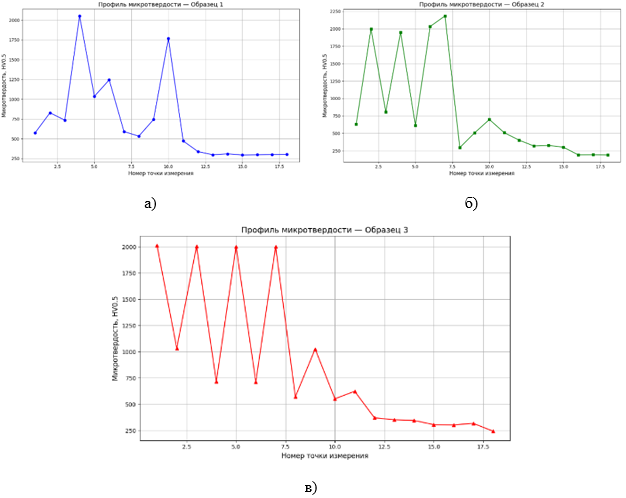 Рисунок 2. Изменение микротвёрдости HV0.5: а) образца 1; б) образца 2; в) образца 3