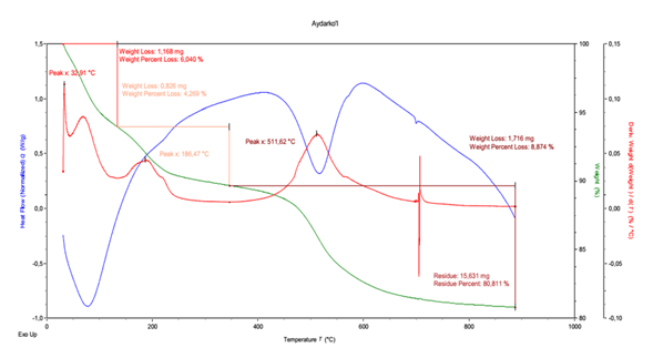 На графике ТГА/ДСК (рис. 1) наблюдаются три основных термохимических эффекта при температурах 33,9 °C, 186,5 °C и 511,6 °C. Суммарная потеря массы составляет около 19 %, что соответствует удалению адсорбированной влаги и дегидроксилизации структурных гидроксилов. Основная экзотермическая реакция при ≈ 511 °C связана с началом перекристаллизации аморфной фазы и образованием более устойчивых силикатных структур. Остаточная масса (≈ 80,8 %) свидетельствует о высокой термической стабильности базальтов Osmonsoy-1 до 900–950 °C.