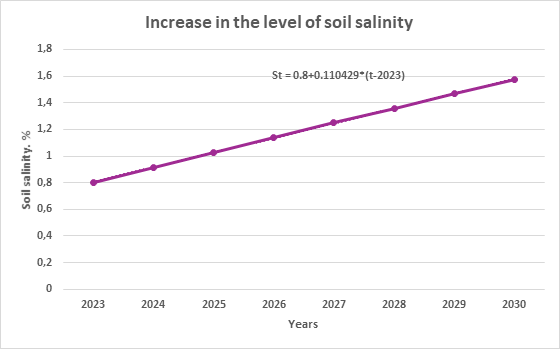 Under constant irrigation‑water mineralization (C = 2.5 kg·m⁻³) and gradually reduced volumes (V), the projection indicates a rise in salinity from 0.800% (2023) to 1.573% (2030) (slope ≈0.110429 %·yr⁻¹), moving from moderately to strongly salted if unmanaged. To avoid adverse meliorative outcomes, water‑saving programs must be coupled with: