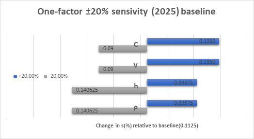 Figure 3. Tornado chart of the screening metric s at 2025 baseline showing the influence of ±20% changes in C, V, h, ρ. Authors’ calculations