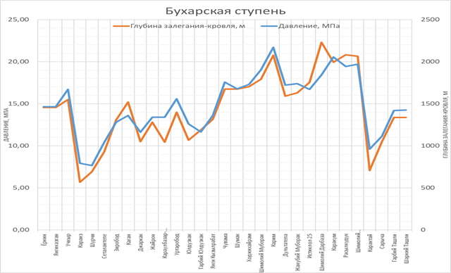 Интервалы залегания нефтегазосодержащих пластов и значения пластовых давлений на месторождениях Бухарской ступени изображены на рисунке 1.