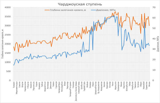 Интервалы залегания нефтегазосодержащих пластов и значения пластовых давлений на месторождениях Чарджоуской ступени представлены на рисунке 2.